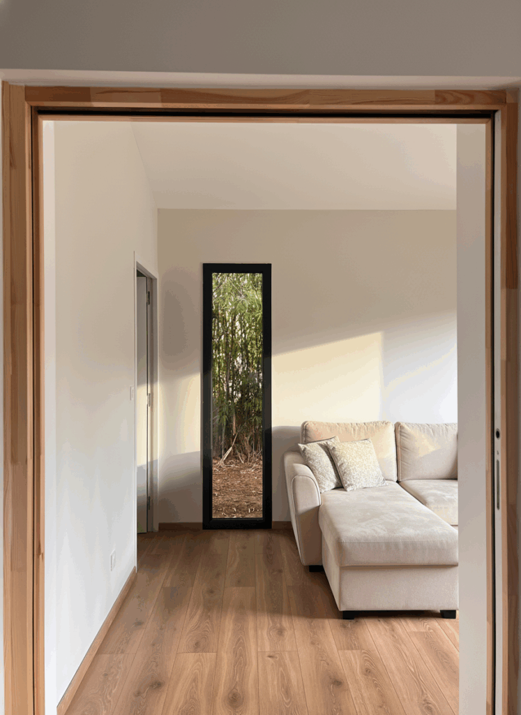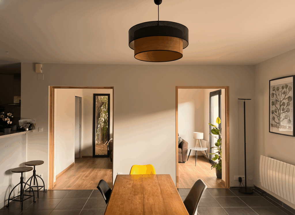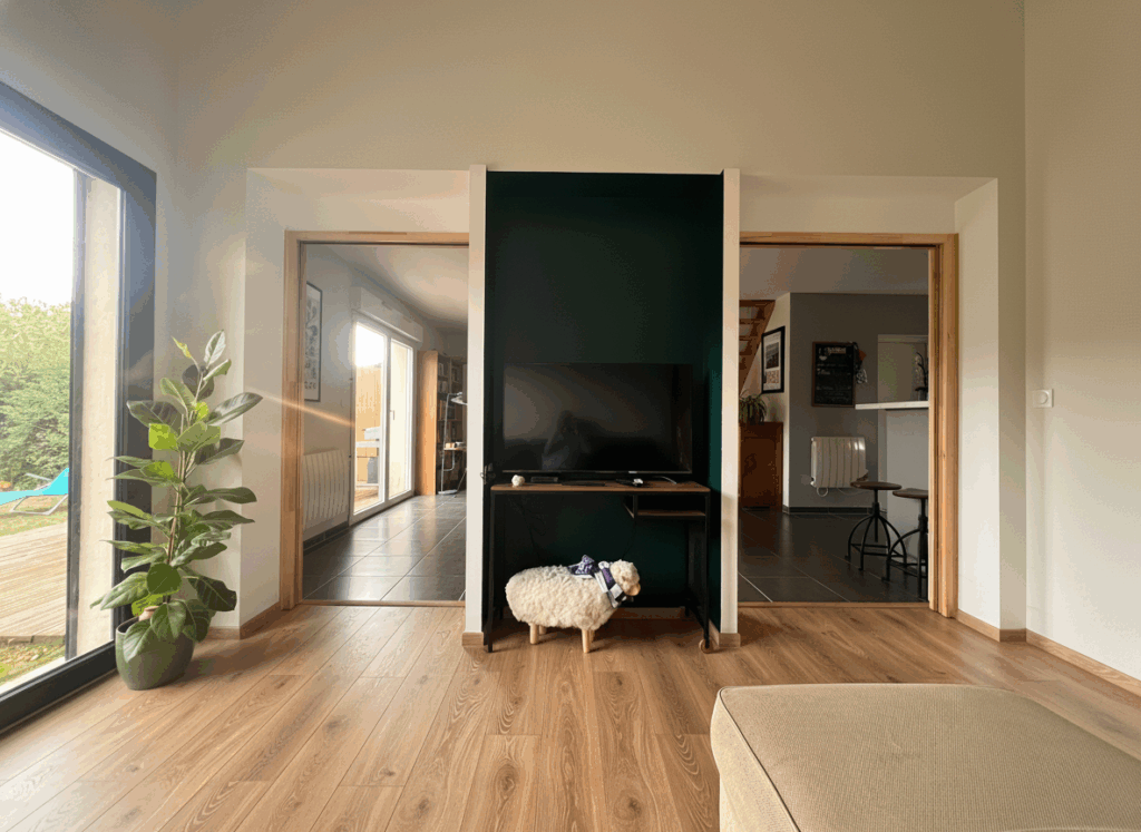 Petite extension d’une maison individuelle pour agrandir le séjour et créer un espace « coin TV » transformable occasionnellement en chambre d’amis.